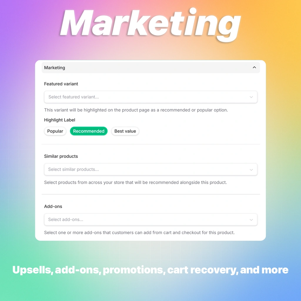 Today's update introduces a broad set of marketing tools designed to help you sell more from the same traffic. You can now layer in add-ons, cross-sells, upsells, and promotions across the storefront, cart, and checkout experience.